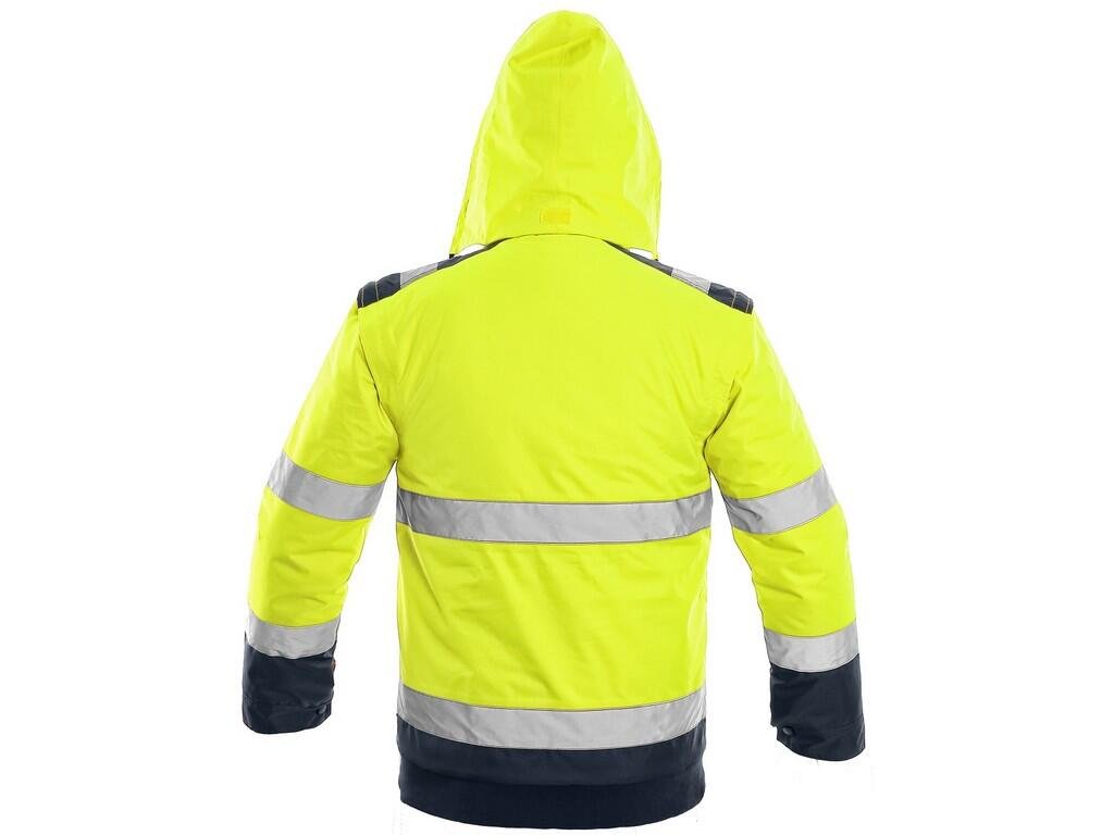 Pánska výstražná zateplená bunda do pása, 2 v 1, odolná proti vode a vetru, reflexné pruhy, lepené švy, zapínaná na zips krytý legou, odopínacie rukávy s regulovateľnými a vnútornými manžetami, kapucňa v golieri, fleecový vnútorný golier, v dĺžke pružný 2 spodné vrecká, dve náprsné vrecká kryté pätkou na suché zipsy, na ľavej strane pútko na prichytenie ID karty, na pravej strane slučka na rádiostanici, jedno vnútorné vrecko. Vnútri je zips pre jednoduchú aplikáciu výšivky na vonkajšej strane bundy. Odporúčané použitie: stavebníctvo, cestári, vodiči, logistika, údržba, smetiari, záchranári, v zime a mokrom prostredí, robotníci.Dodatočné parametre