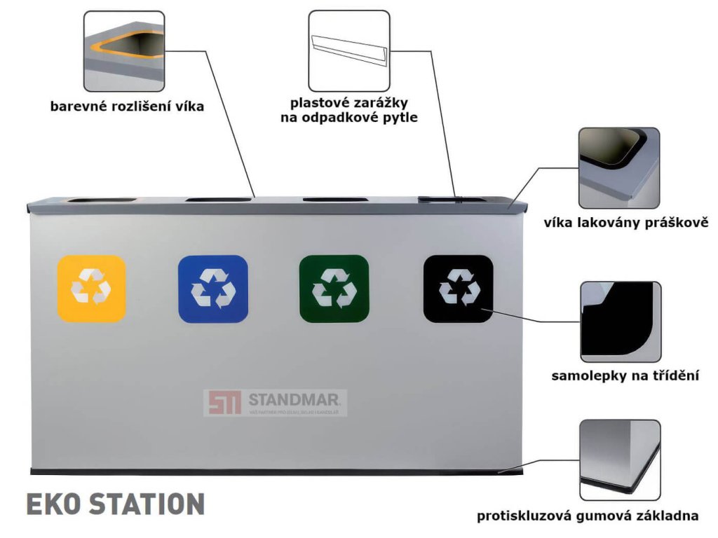 Moderná triediaca stanica s objemom 4×60 litrov je navrhnutá na efektívne triedenie odpadu vo vnútorných priestoroch – kanceláriách, školách aj domácnostiach. Vyrobená z lakovanej ocele, s plastovým podstavcom proti korózii a poškodeniu podlahy. Koše sú vybavené horným vekom s otvormi, držiakmi vriec a farebnými nálepkami na jednoduché rozlíšenie odpadu. Možno doplniť o vnútorné plastové nádoby.