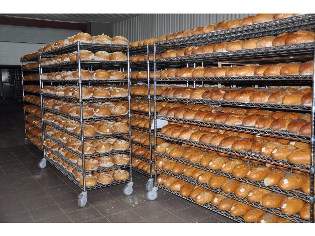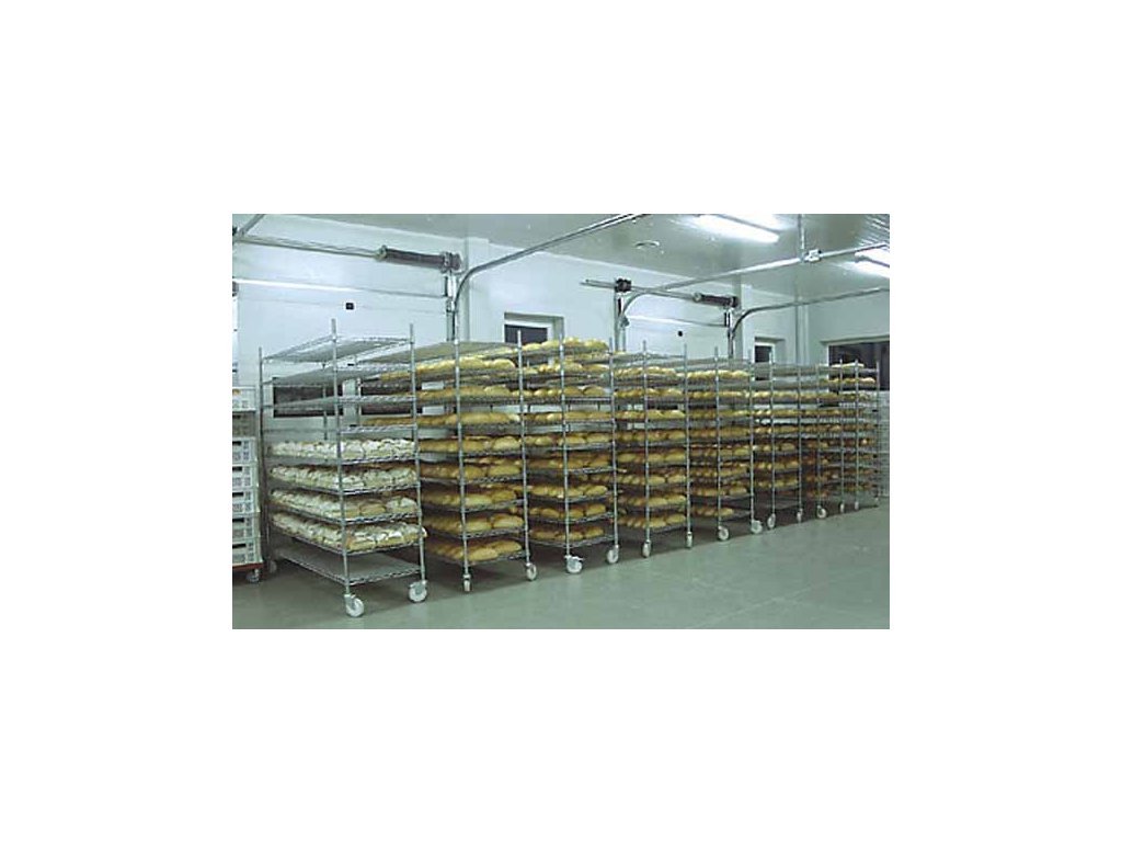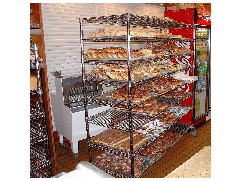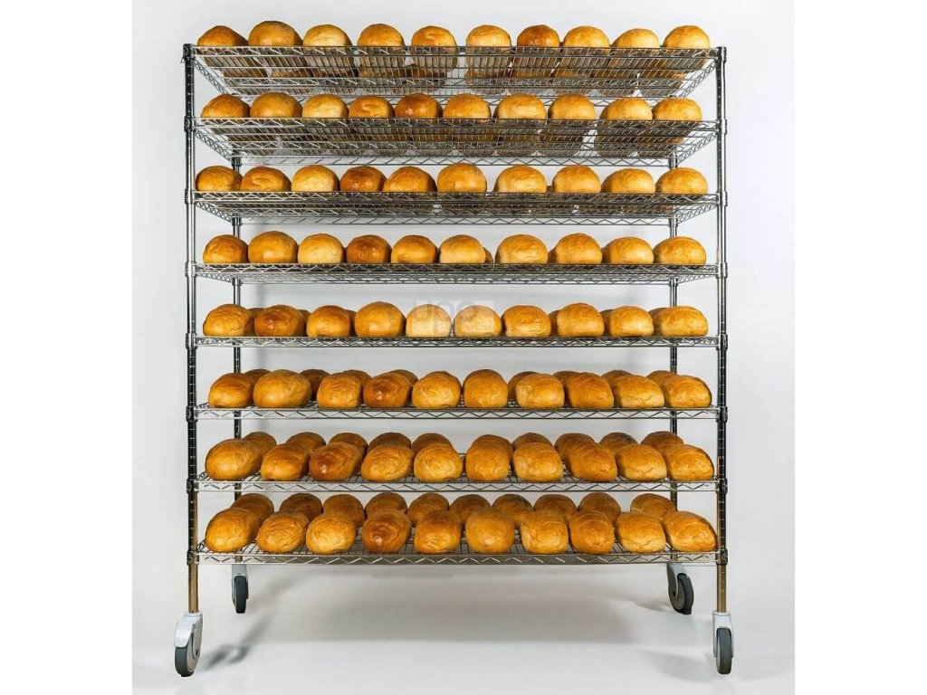 Chrómovaný potravinársky (pekárenský) policový vozík na chlieb určený predovšetkým pre pekárne, cukrárne, potravinárske výrobne a predajne pečiva. Umožňuje bezpečné a prehľadné uloženie veľkého množstva chlebov či iného pečiva na minimálnej ploche a uľahčuje manipuláciu v prevádzke vďaka otočným kolesám.