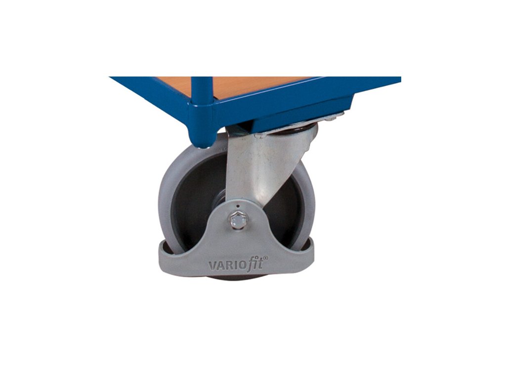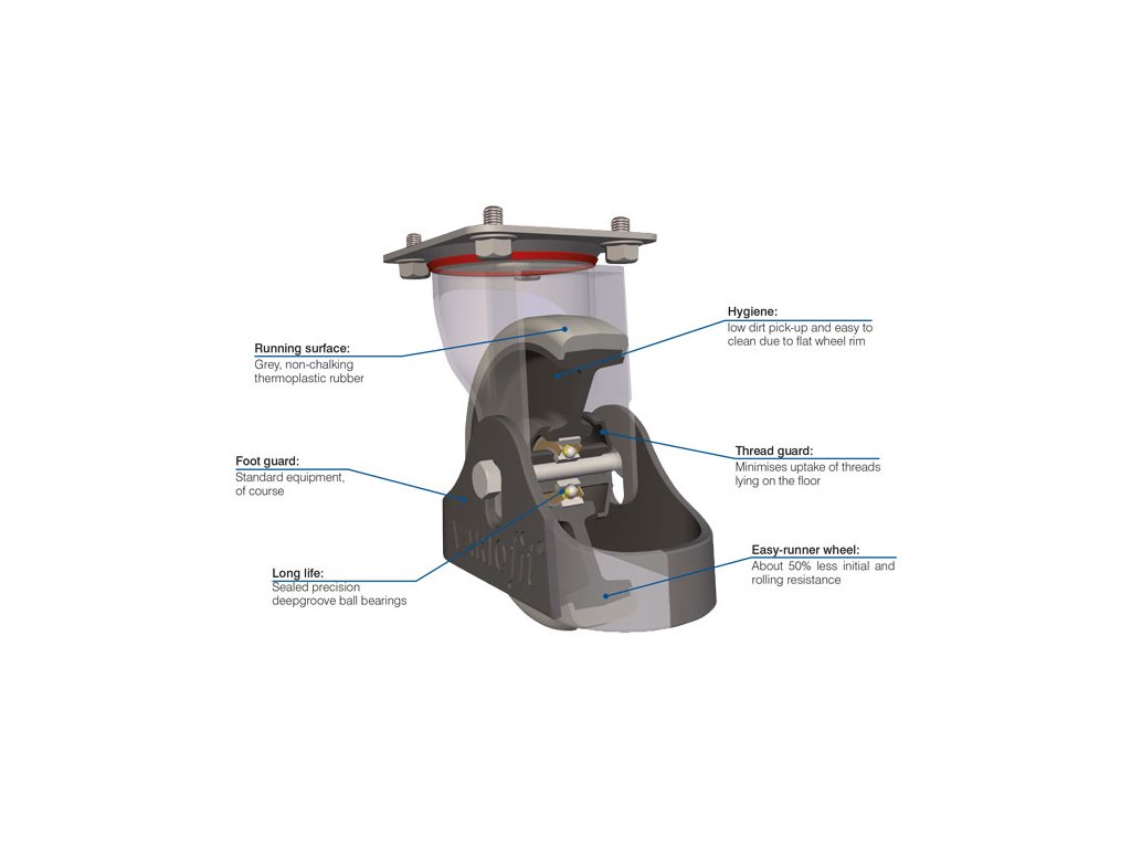 - kolesá: šedé kolesá z termoplastickej gumy, plastový ráfik, presné guličkové ložisko, nezanecháva stopy, Ø 125 mm, 2 otočné kolieska s centrálnou brzdou EasySTOP a 2 pevné kolieska, otočné kolieska s chráničom nôh