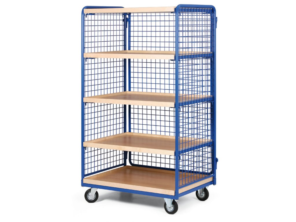 Policový vozík vysoký, tri strany drôtené, päť poschodí z ohranenej drevotriesky, 300 kg