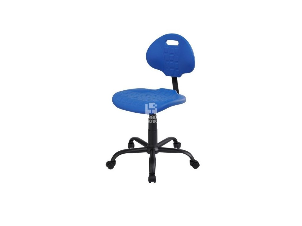 Nízka otočná laboratórna stolička. Operadlo a protišmykový sedák z mäkkého polyuretánu v modrej farbe (RAL 5005). Nastavenie výšky sedadla plynovým piestom. Čierna kovová základňa. Kreslo je k dispozícii na kolieskach.Dodatočné parametre