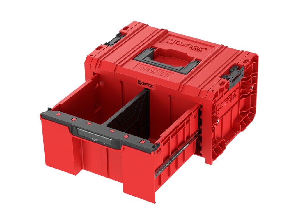 Qbrick System PRO Drawer 1 Toolbox 2.0 Basic RED Ultra HD je priestranný, modulárny box na náradie vybavený zásuvkou na kovových vodidlách. Aretačné tlačidlo poskytuje ľahký prístup k ich obsahu.