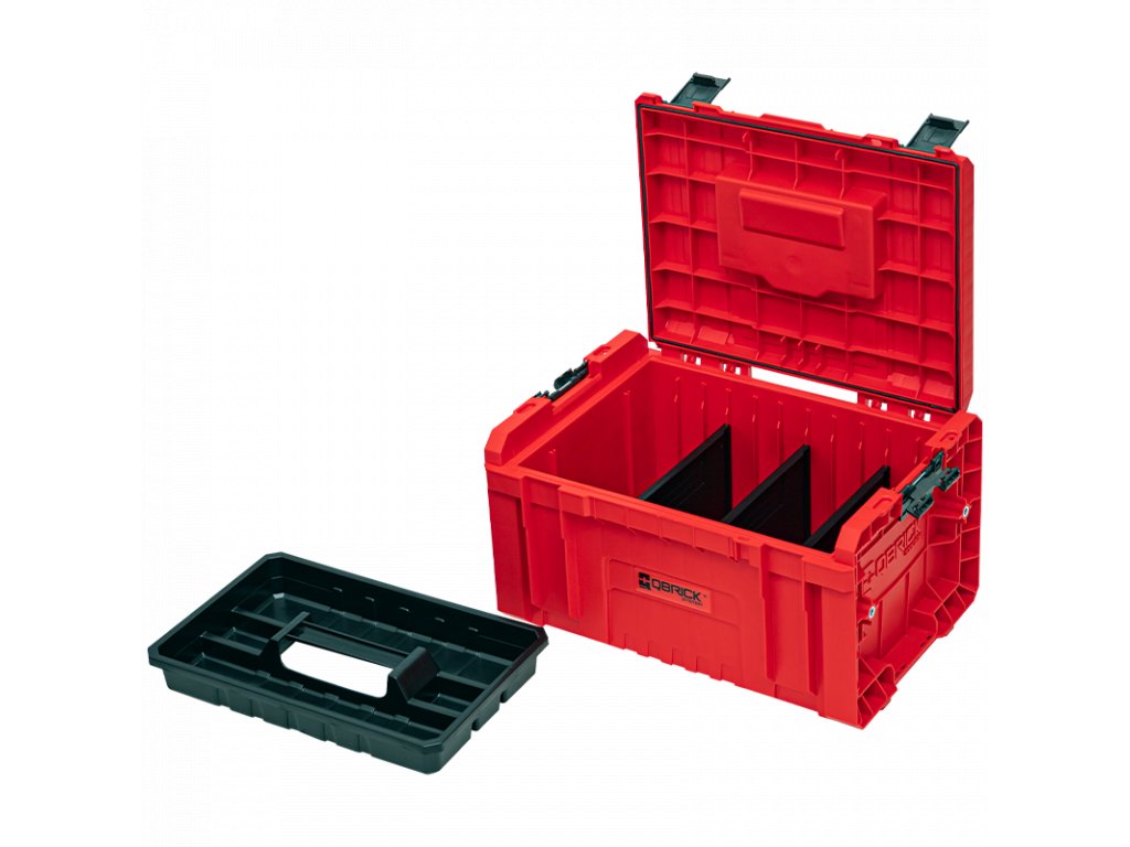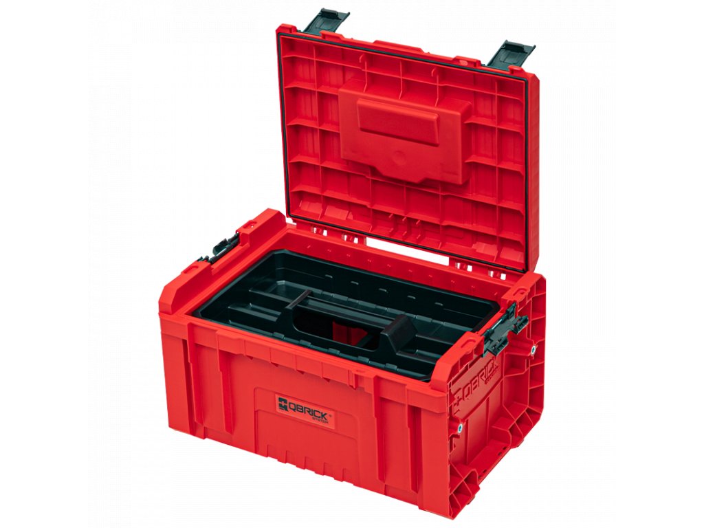 Qbrick System PRO Toolbox RED ultra HD je priestranná, modulárna skrinka na náradie, ktorá už v štandardnej výbave ponúka množstvo funkcií: flexibilné tesnenie zabudované do veka pre vysokú odolnosť proti prachu a vode, 3 nastaviteľné prepážky, priestranný zásobník a bočné konektory a predné upevňovacie prvky zo superpevného polyamidu .