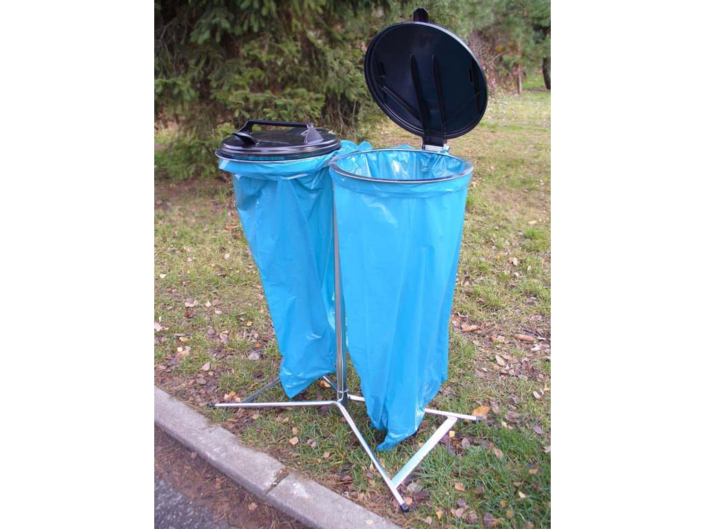 Stojan na dva vrecia s objemom 120 litrov. Plastové veká, ale robustná pozinkovaná konštrukcia s váhou 10 kg.