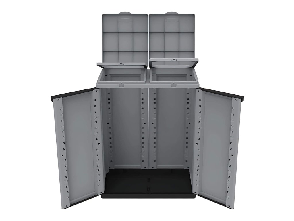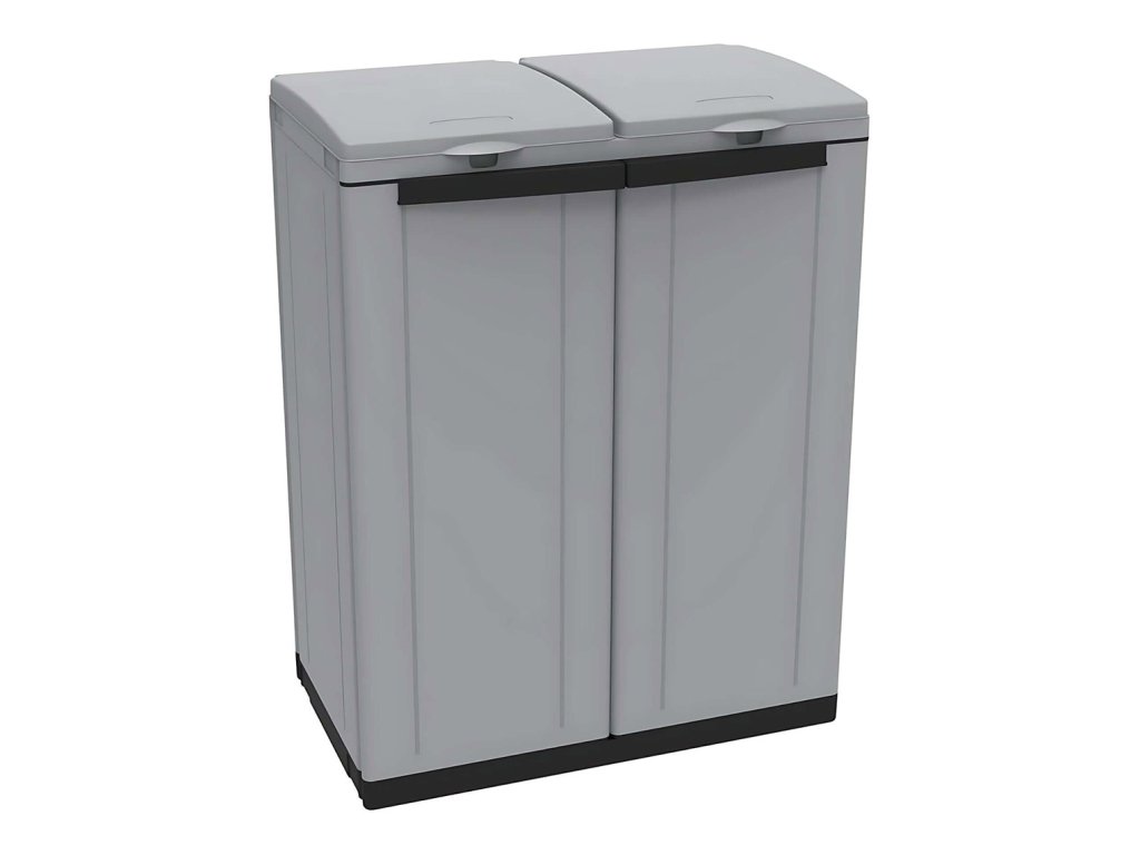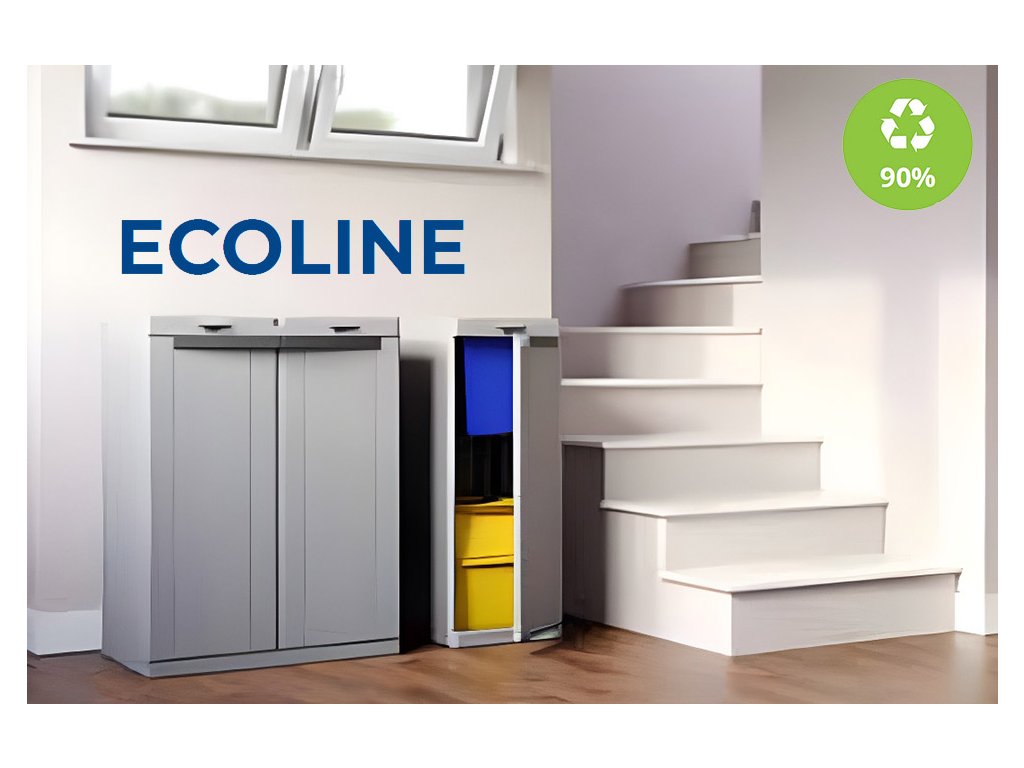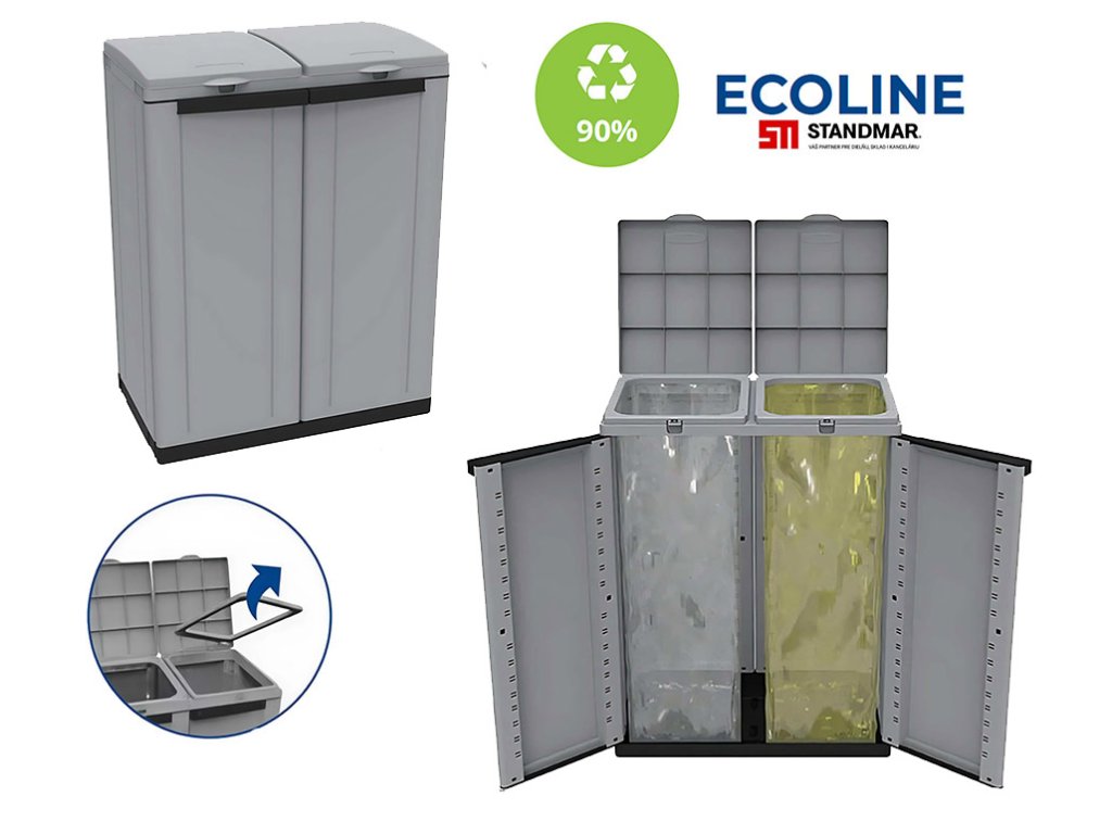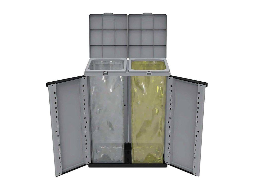 Elegantná a praktická plastová skriňa vhodná na vnútorné aj kryté vonkajšie použitie (odolná voči dažďu). Spája atraktívny dizajn s funkčnosťou pre efektívne triedenie odpadu.
