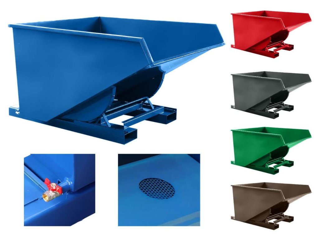 Svařen z plechu tloušťky 3 mm se zesíleným okrajem po obvodu kontejneru. Robustní výklopný mechanismus, který umožňuje vyklopení z místa řidiče vysokozdvižného vozíku pomocí ocelového lanka, po vyklopení se prázdná vana vrátí do původní polohy a automaticky se zajistí. Kontejner musí být při vyklápění z vysokozdvižného vozíku zajištěn řetězem proti nechtěnému sklouznutí z vidlic vozíku. Řetěz i ocelové lanko jsou součástí dodávky. Včetně kapes pro vidlice vysokozdvižných vozíků.