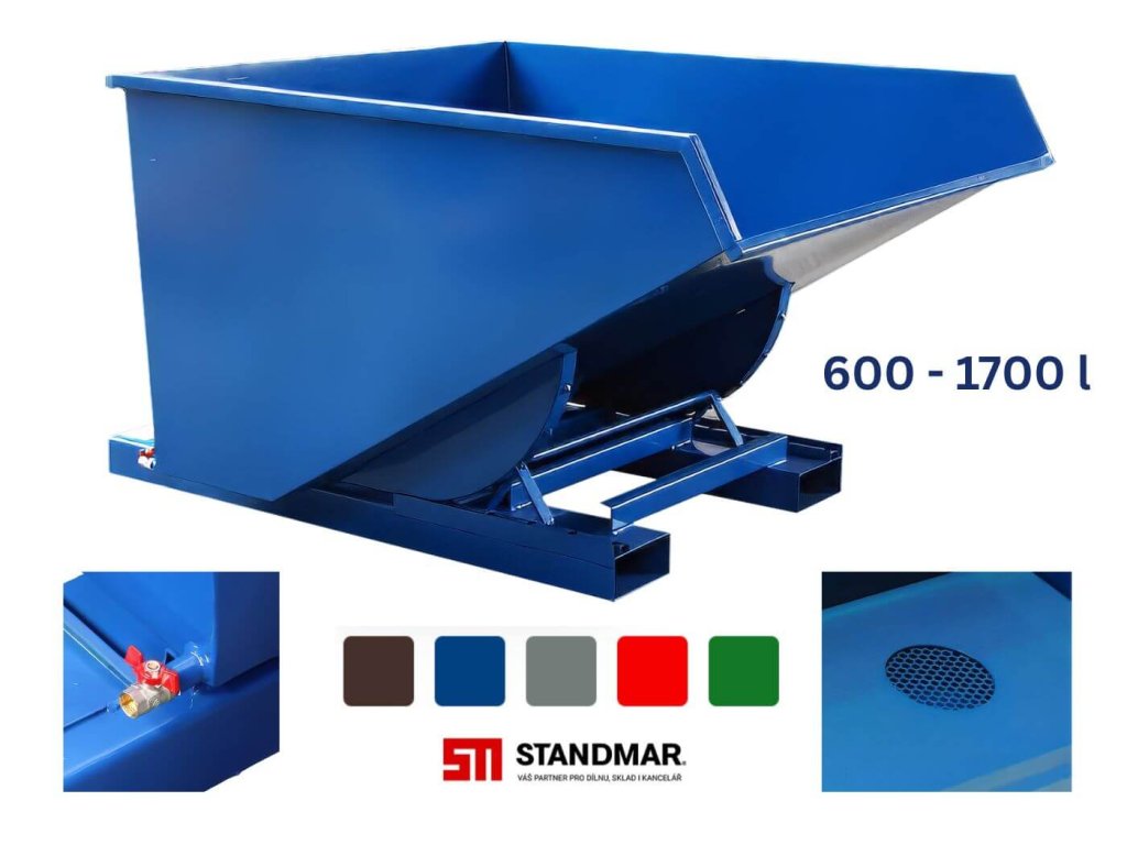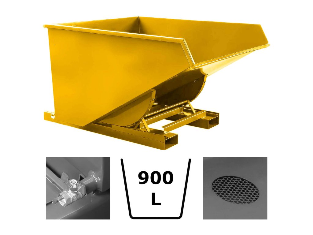 Svařen z plechu tloušťky 3 mm se zesíleným okrajem po obvodu kontejneru. Robustní výklopný mechanismus, který umožňuje vyklopení z místa řidiče vysokozdvižného vozíku pomocí ocelového lanka, po vyklopení se prázdná vana vrátí do původní polohy a automaticky se zajistí. Kontejner musí být při vyklápění z vysokozdvižného vozíku zajištěn řetězem proti nechtěnému sklouznutí z vidlic vozíku. Řetěz i ocelové lanko jsou součástí dodávky. Včetně kapes pro vidlice vysokozdvižných vozíků.